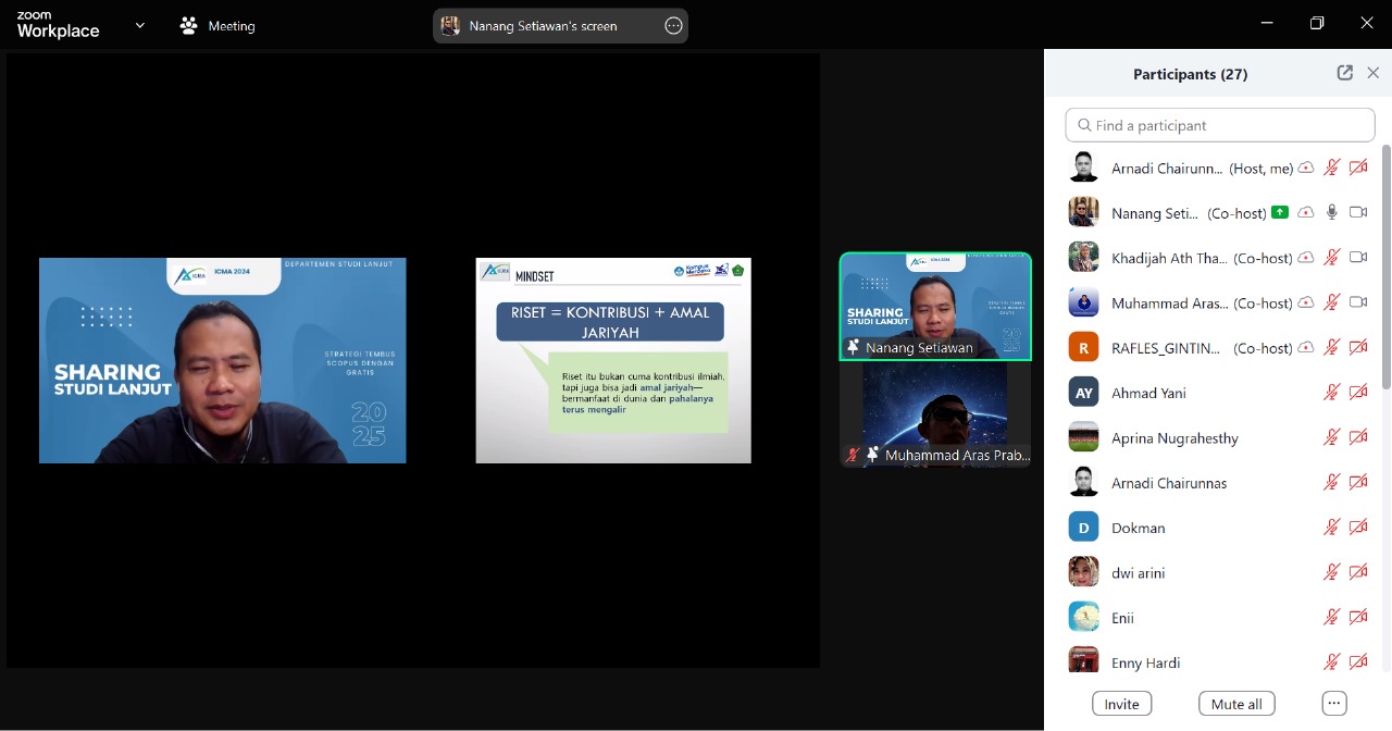 Kegiatan ditutup dengan foto bersama dan harapan agar para peserta dapat segera menerbitkan artikel mereka di jurnal-jurnal terindeks Scopus. ICMA berkomitmen akan terus memfasilitasi forum sejenis, baik dalam bentuk webinar, pendampingan teknis, maupun kolaborasi riset lintas institusi.